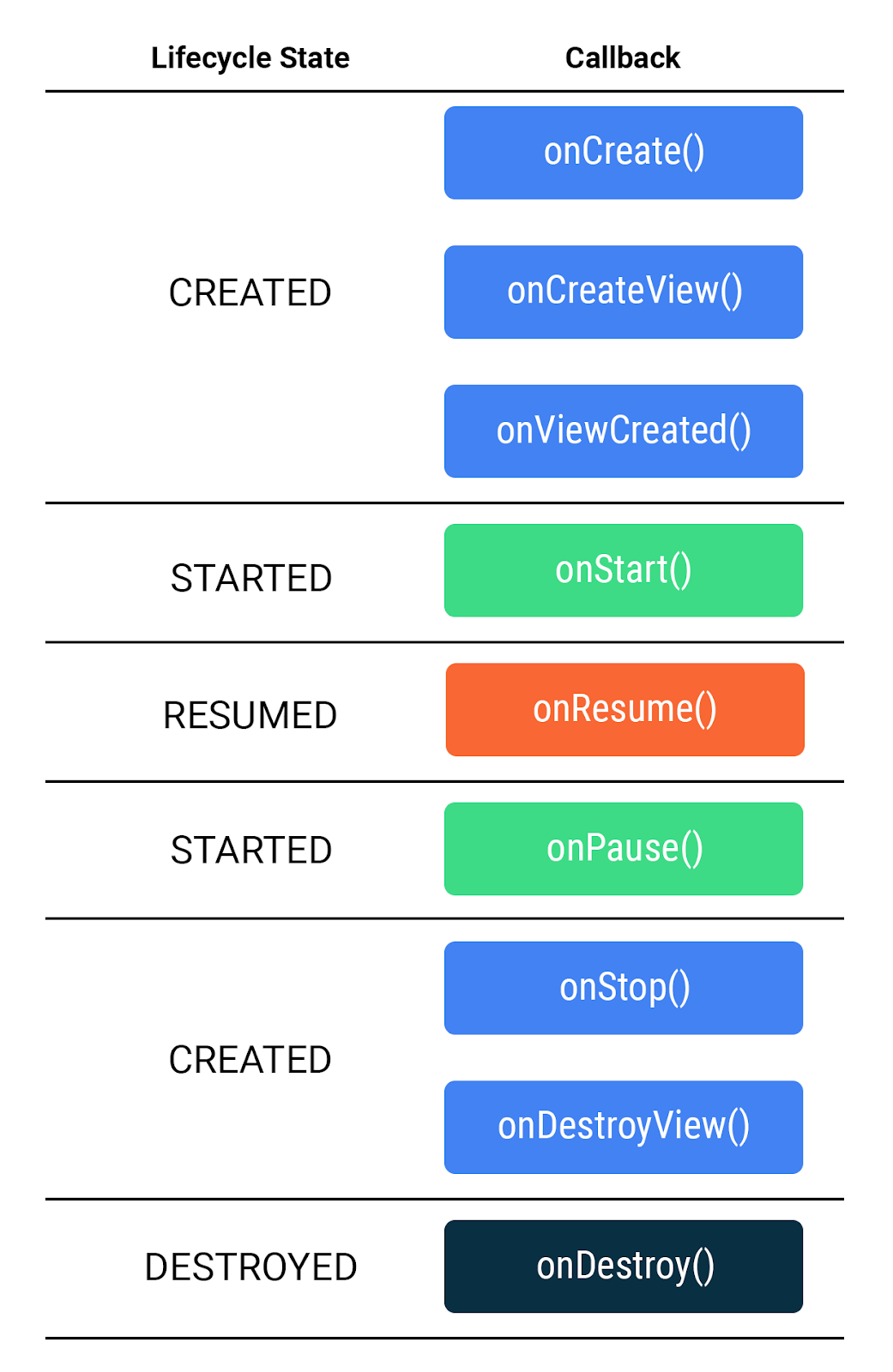 The chart below summarizes the fragment lifecycle, and the transitions between states.
