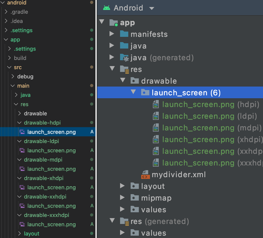 크기 순서 l<m<h<xh<xxh<xxxh 모두 같은 파일명(launch_screen.png)로 해야한다.
